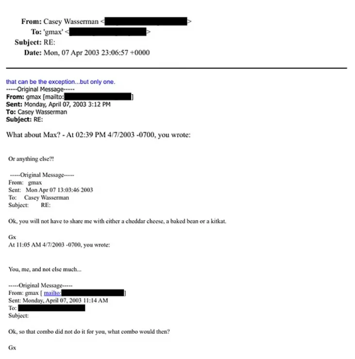 在一封2003年4月1日的邮件中,Wasserman写道:“你在哪?我想你了……我4月22日会在纽约待四天,我们现在可以把‘按摩’约起来了吗?”