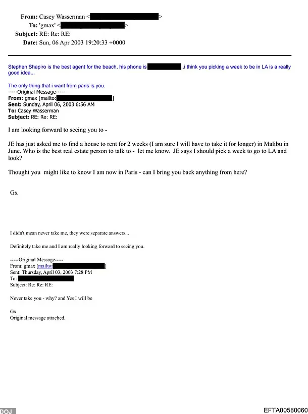 美国司法部最新解封的一批爱泼斯坦相关文件中,披露了多封2003年的私人邮件,引发舆论关注。邮件显示,洛杉矶2028年奥运会组委会主席、好莱坞超级经纪人Casey Wasserman,曾与爱泼斯坦长期同伙、现正在服刑的Ghislaine Maxwell互通内容暧昧、带有明显性暗示的邮件。