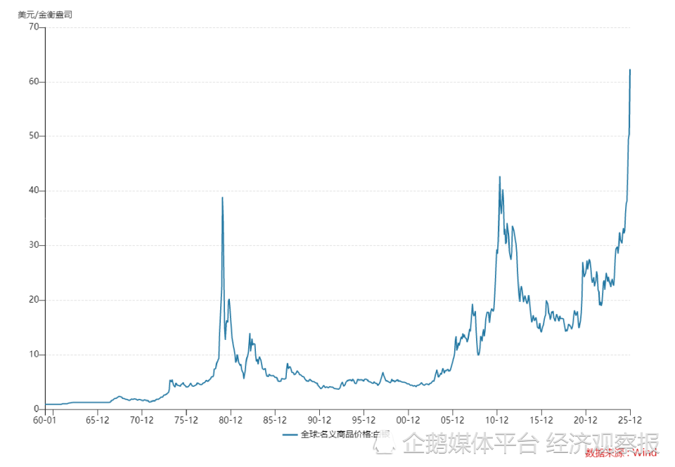 记者亦留意到,本轮银价主升浪虽然始于2025年11月,但牛市的起步却在2022年的7月份。CMX白银主连合约从彼时的17.40美元/盎司涨至2026年1月份的121.79美元/盎司,历时3年半,涨幅约600%。在白银有数据统计的历史上,能够及得上这一“牛市规格”的牛市曾有两次,分别是1980年的亨特兄弟挤仓行情和2011年的量化宽松投机热潮。