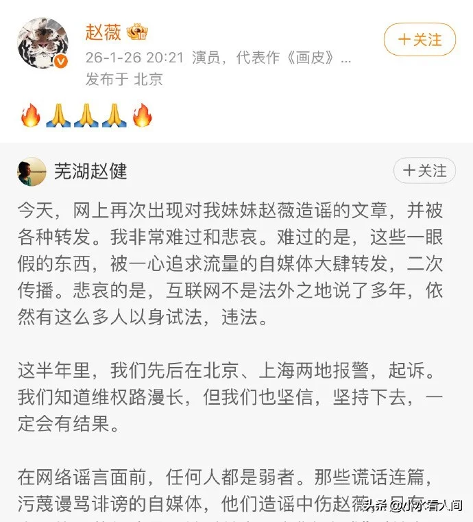 紧接着,赵薇哥哥赵健气愤发帖,对那篇文章所写内容进行了否认,心疼妹妹遭遇无妄之灾,声称将拿起法律武器起诉造谣的人。
