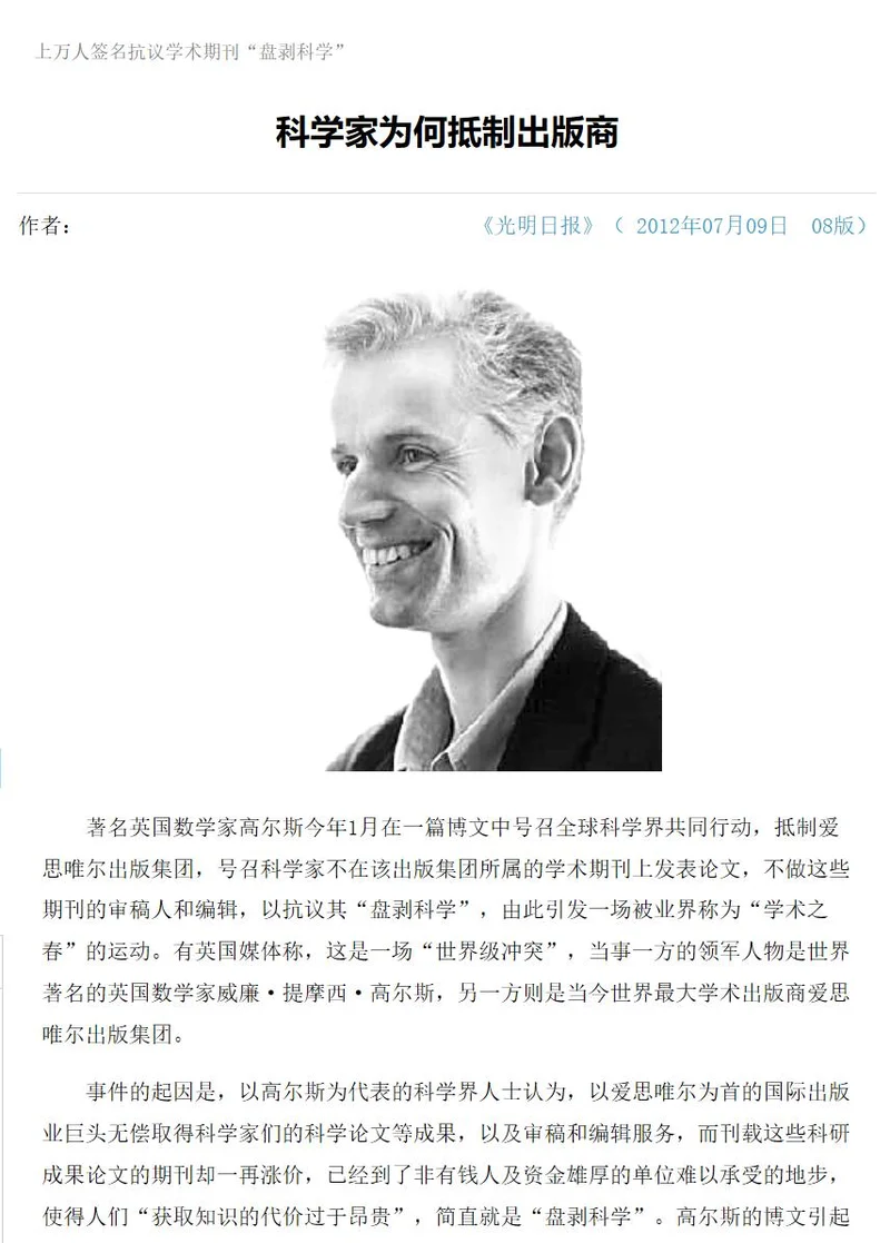 早在2012年,就发生过一次由剑桥大学数学家发起的、全球上万名科学家联合签名支持的“抵制爱思唯尔运动”。这个运动号召科研人员拒绝为爱思唯尔旗下的学术期刊投稿和评审,向爱思唯尔施加压力,希望降低费用。