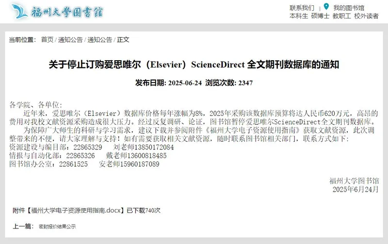 去年6月,福州大学公告称,采购该数据库预算将达人民币620万元,高昂的费用造成了很大压力,决定暂停使用爱思唯尔ScienceDirect全文期刊数据库。