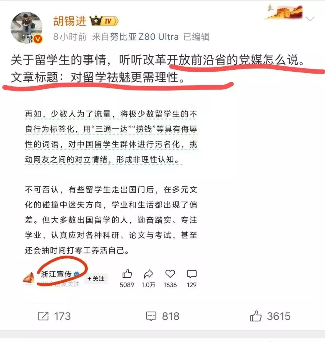 为何说是一下下,因为胡锡进没有直抒胸臆的表达这件事的观点,而是半遮面半撇嘴的说了一句:“关于留学生的事情,听听改革开放前沿省的党媒怎么说”