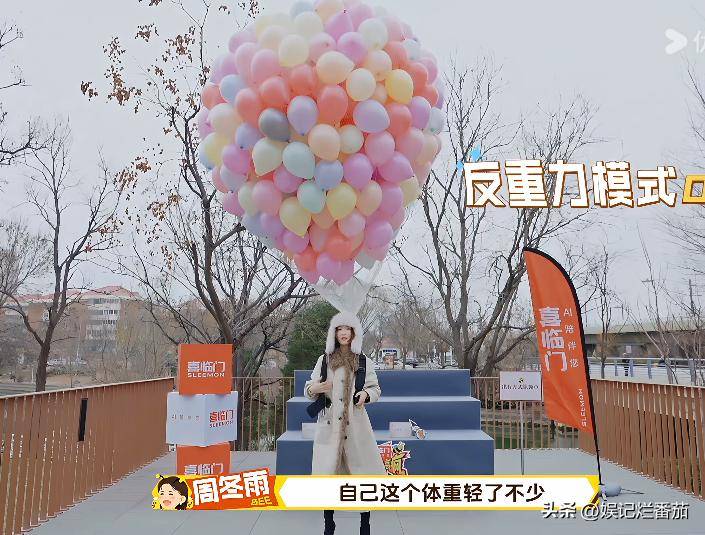 在穿着高跟鞋的基础上,身后背了一串的气球。