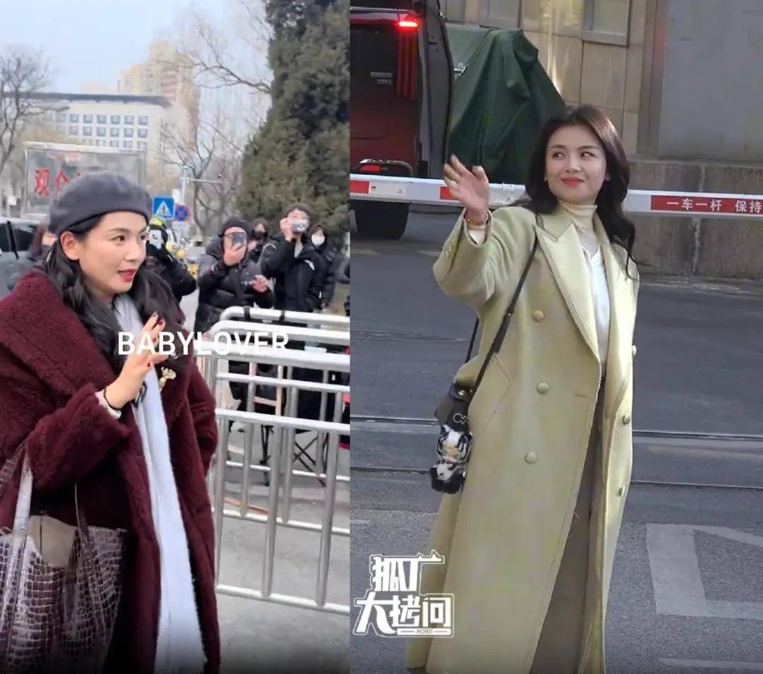 刘涛这两天已经参加了两次彩排,两次造型都很讲究:第一套贝雷帽加红色大衣,还挎了个名牌包,还有一条很长的淡紫色围巾,略显浮夸;第二套配色清爽很多,更能凸显她的气质。