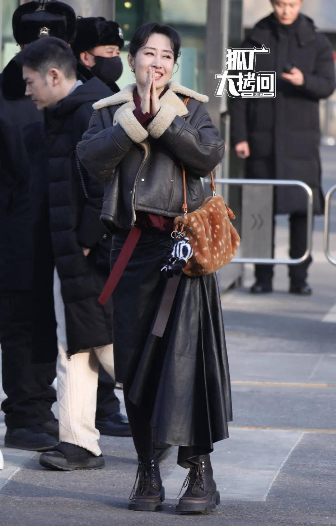 刘敏涛走的是酷帅皮衣风,从外套到靴子都是和谐的,整体中规中矩,反倒是棕色毛绒单肩包能起到很好的点缀,加上了一些可爱气息。