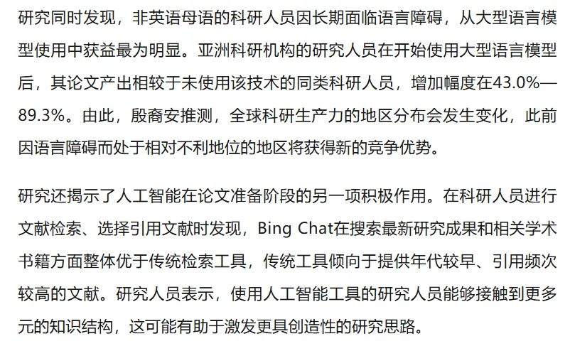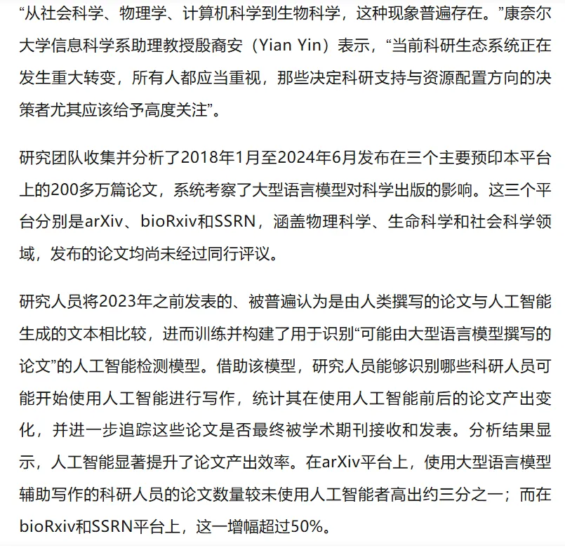美国康奈尔大学研究人员近期发表在《科学》期刊上的一项研究显示,这类现象反映的并非个别案例,而是学术写作方式正在发生转变。研究发现,使用ChatGPT等大型语言模型能够显著提高论文产出数量,对非英语母语的科研人员的帮助更为明显。然而,人工智能生成论文的数量激增,也使得审稿人、科研资助机构以及政策制定者越来越难以区分真正具有学术贡献的研究成果与人工智能生成的低质量、同质化论文。