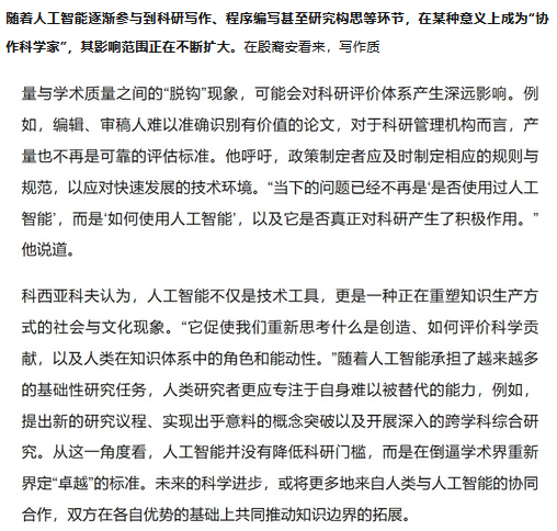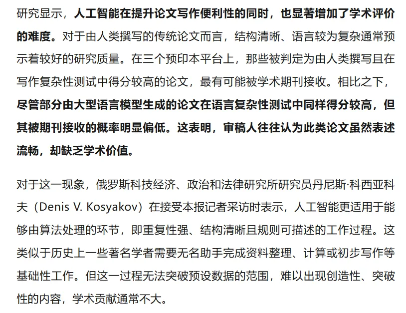 生成式人工智能诞生以来,科研人员普遍感受到新一代人工智能工具在提高写作与研究效率方面的显著作用。与此同时,学术期刊编辑频频反映,投稿系统中涌入了大量语言流畅但学术价值有限的平庸论文。