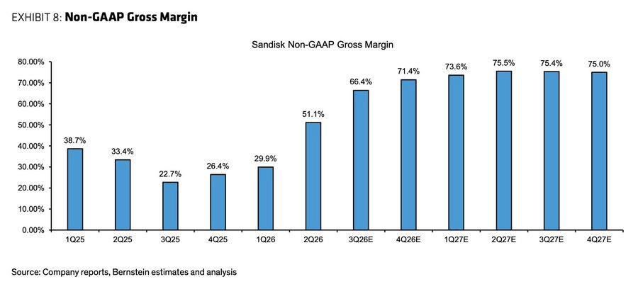 伯恩斯坦将闪迪目标价暴涨至1000美元,较当前股价仍有85%上涨空间,估值却仅为11倍2027财年PE。关键看点在于公司毛利率的爆发式扩张——二季度Non-GAAP毛利率已达52.1%,远超市场预期的42%,而三季度指引更是高达65-67%,这意味着公司正进入超级盈利周期。