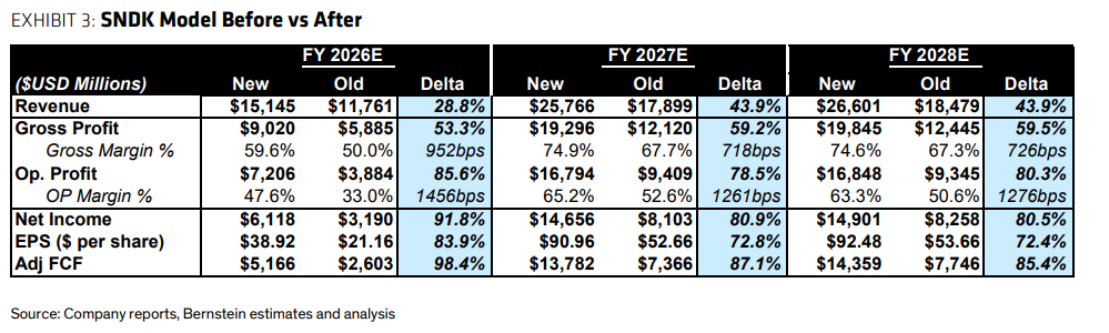 在强劲财报后,伯恩斯坦分析师Mark C. Newman将闪迪(SanDisk)目标价从580美元大幅上调至1000美元,上调幅度达72%。激进的目标价基于该机构对公司2027财年每股收益90.96美元的预测,对应市盈率仅为11倍。