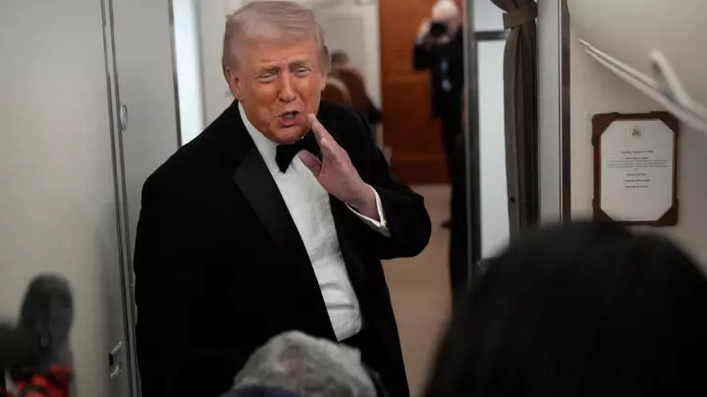 在空军一号上,面对记者的美国总统特朗普。 © 美联社图片
