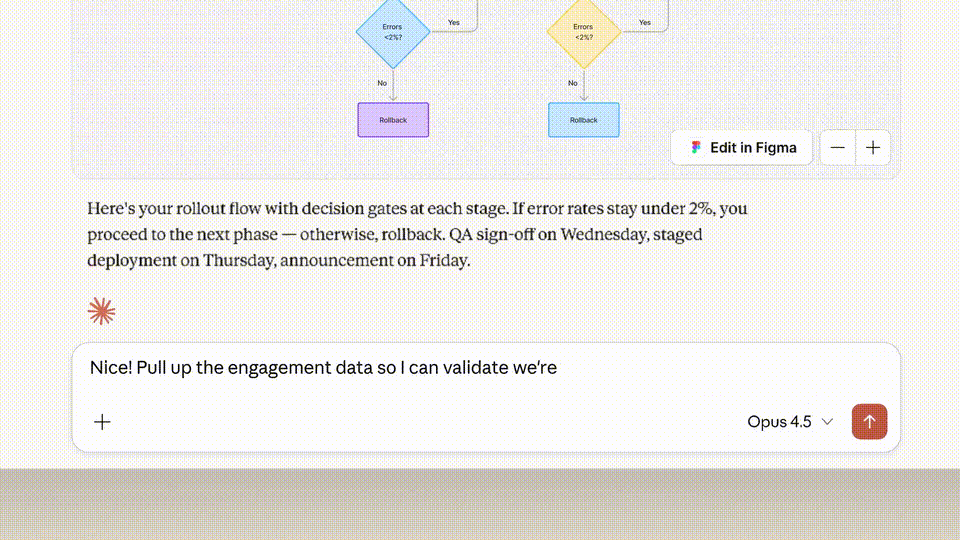 不论是起草Slack消息、将构思可视化为Figma图表,还是创建并查看Asana时间轴,一键完成操作。