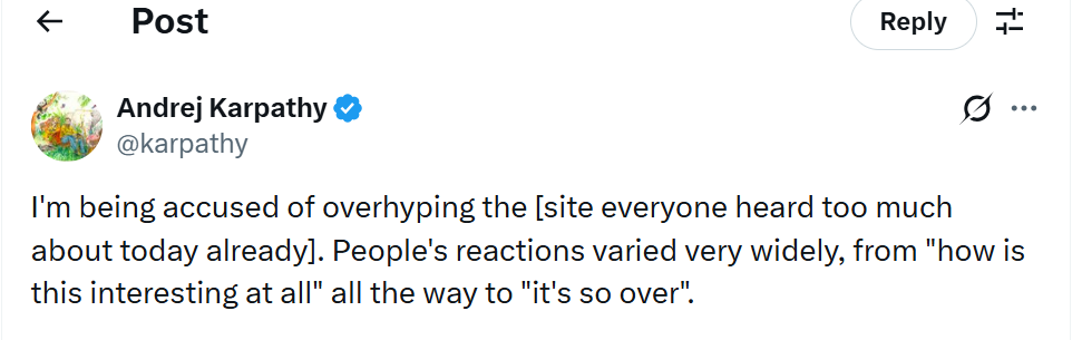 Karpathy在社交媒体上表示,Moltbook目前的运行状态堪称“垃圾场(dumpster fire)”,充斥着加密货币推销、垃圾邮件以及令人担忧的隐私和提示注入攻击。他明确不建议用户在个人电脑上运行相关程序,指出这是一个狂野且高风险的“西部世界”。然而,他也指出,外界对该项目的评价存在分歧,核心在于观察者是关注“当前的落点”还是“当前的斜率”。