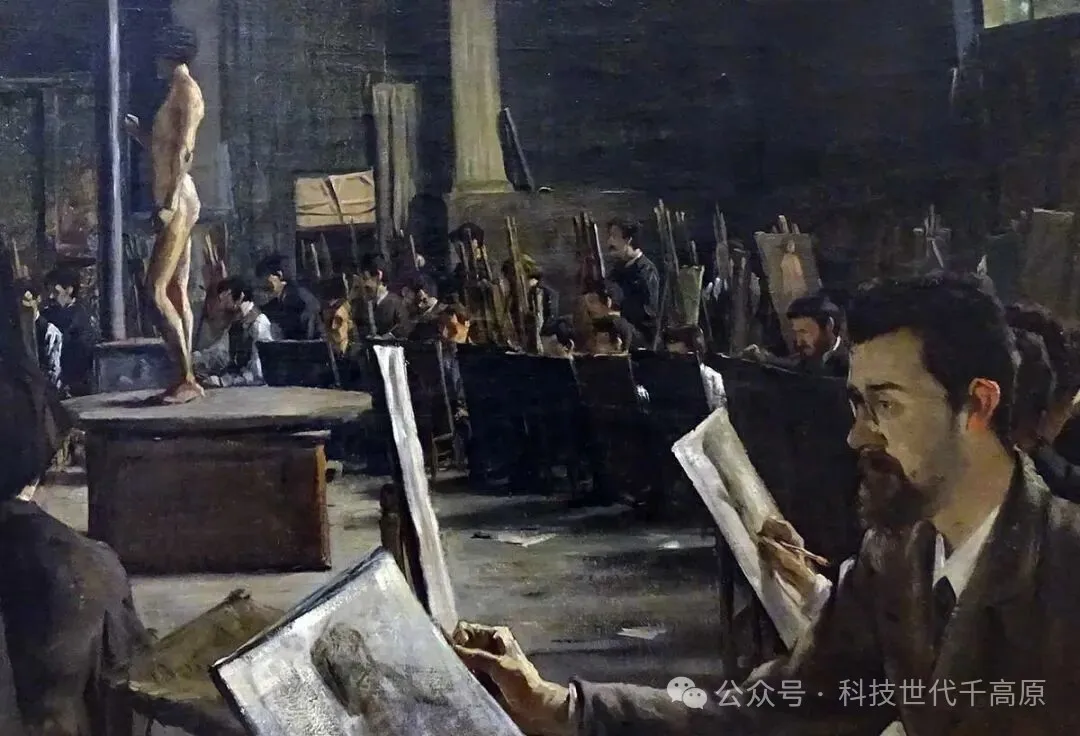 Cabanel 在巴黎美术学院的工作室,Jean Célestin Tancrède Bastet 创作,1883 年。来源:Wikimedia Commons