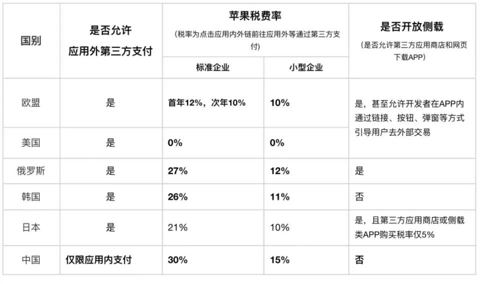 截至目前,中国市场上的App Store依然维持着全球最高抽成:开发者需向苹果支付高达30%的标准佣金(年收入100万美元以下的中小开发者享受15%的优惠费率),并被严格禁止使用第三方支付或引导用户至外部网页完成交易。这种封闭政策构成了“三方剥夺”,开发者利润被挤占、消费者被隐性加价、产业竞争力被抑制。