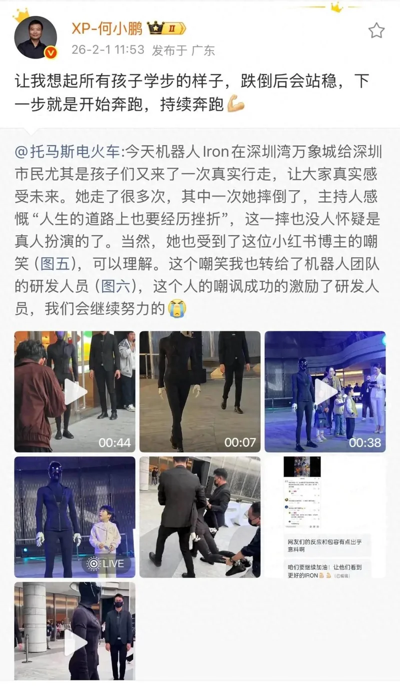 2月1日,小鹏汽车董事长、CEO何小鹏回应争议:“(这一摔)让我想起所有孩子学步的样子,跌倒后会站稳,下一步就是开始奔跑,持续奔跑。”