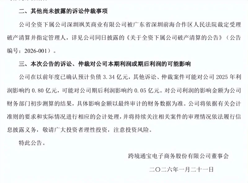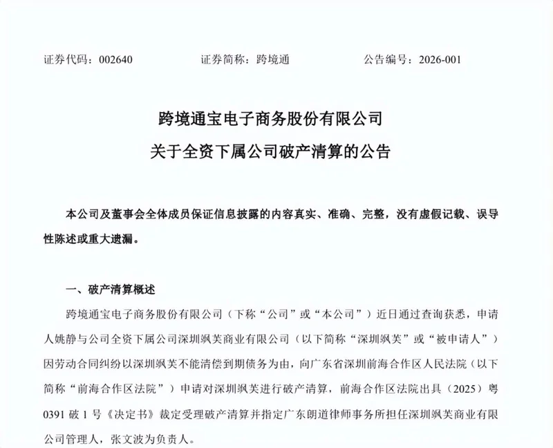 2026年1月,根据跨境通披露的公告,这个昔日被称为 “跨境电商第一股” 的巨头,其全资下属公司深圳飒芙,因资不抵债被法院裁定破产清算。
