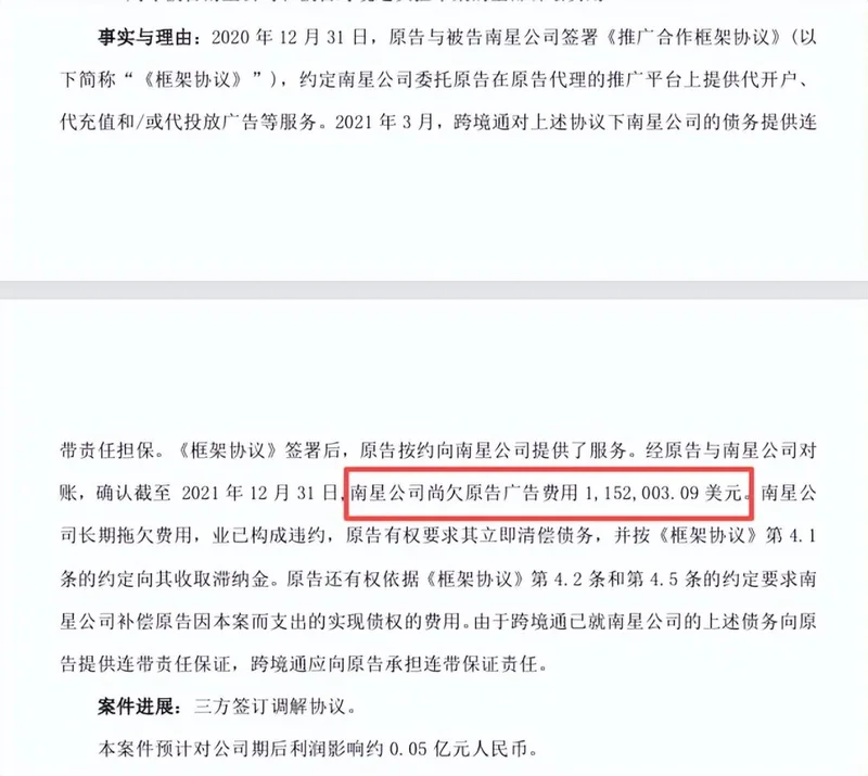 由于为子公司香港南星拖欠的这笔广告费提供连带担保,跨境通不得不吞下苦果,预计承担约500万元的利润损失。