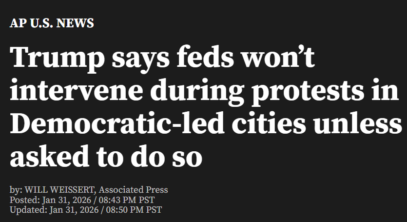 据2月1日报道,美国总统川普1月31日周六表示,他已指示国土安全部长诺姆(Kristi Noem),在由民主党领导的城市发生抗议活动时,除非地方政府主动请求联邦协助,否则不得介入。