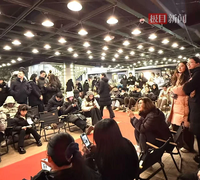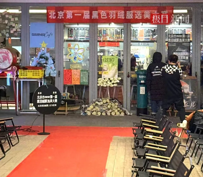 1月31日晚,多位网友晒出带有相关文案的活动现场图片。画面显示,在名为“跳海”的店铺门口悬挂着“北京第一届黑色羽绒服选美大赛”横幅,现场铺设红毯、设置观众席与话筒,聚集了大量身着黑色羽绒服的人群,场面十分热闹。