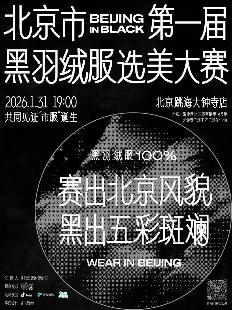 据樊女士此前发布的活动规则,“北京第一届黑色羽绒服选美大赛”于1月31日19时在跳海大钟寺店举行,评选标准包括“实用性”“稀有度”和“美观度”,并明确要求“只要黑羽绒”!黑棉服、黑羊绒大衣及白羽绒服均不符合参赛条件,比赛的活动口号为“赛出北京风貌,黑出五彩斑斓”。