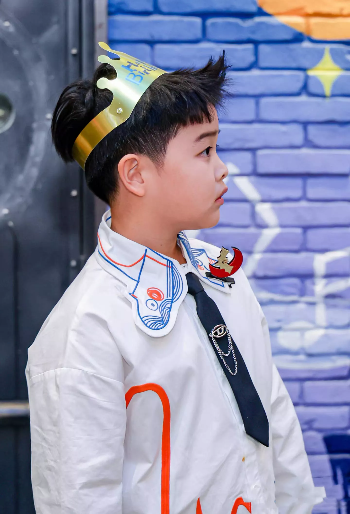 作为小寿星,朵朵打扮的清爽帅气。穿了一件白色刺绣元素的衬衫,还搭配了韩式领结,时髦洋气也很酷。是那种干净、阳光的帅气,越看越像陈思诚。