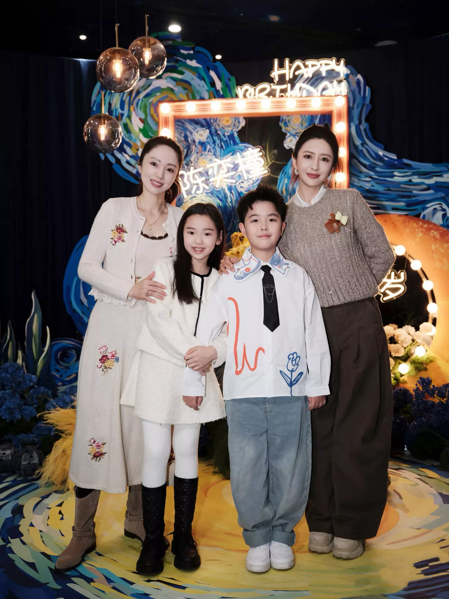 佟丽娅董璇和俩娃的合影,小酒窝挽着朵朵的胳膊,身体向着朵朵倾斜,有一种小女娃很依赖哥哥的感觉。