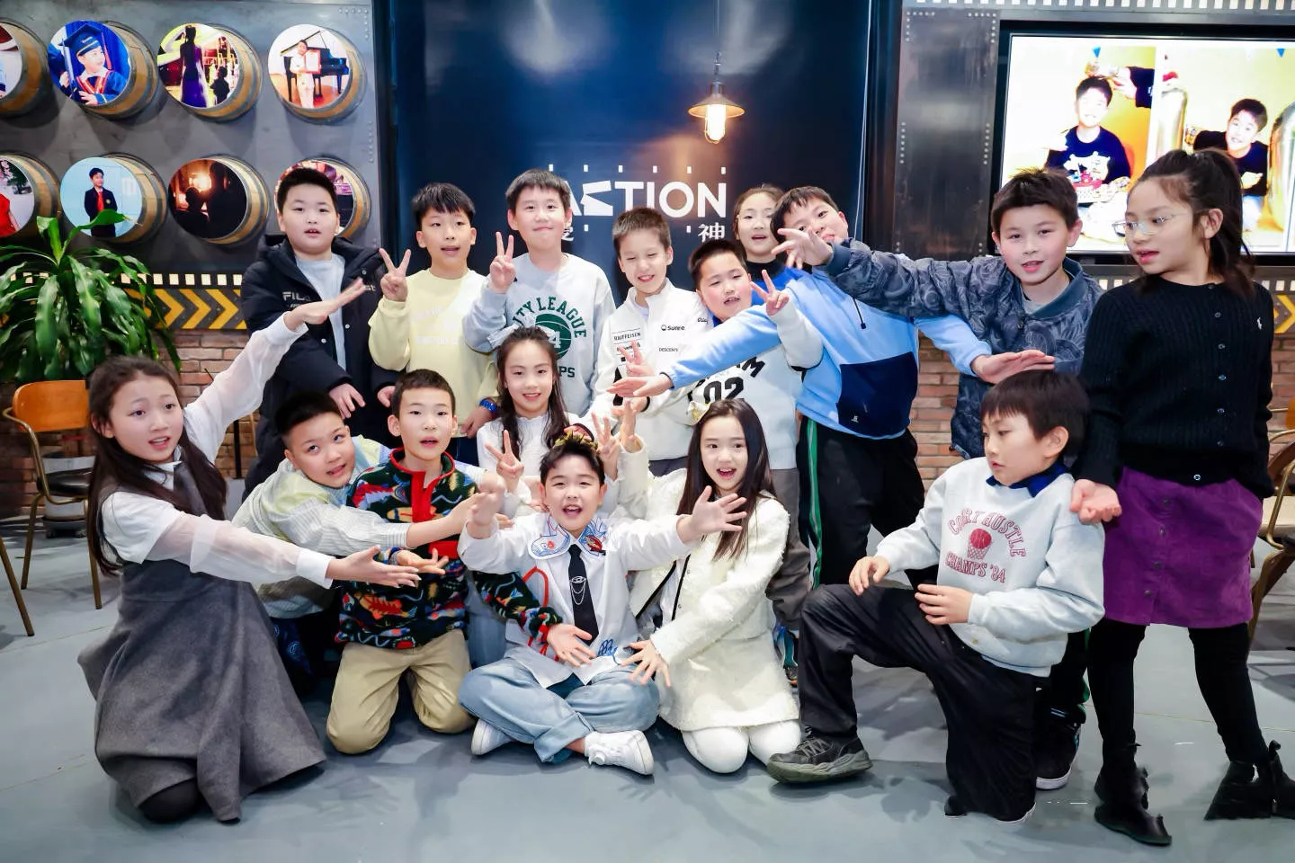 大合影里,朵朵和小酒窝在最中间的位置。朵朵伸开双手,小酒窝一手比耶、另一只手自然的放在朵朵的膝盖上。