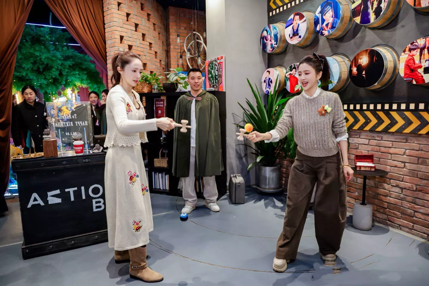 小酒窝一身白色小香风套裙,朵朵穿白衬衫、牛仔裤。显然朵朵的打扮更加休闲一些,小酒窝走的是精致风。