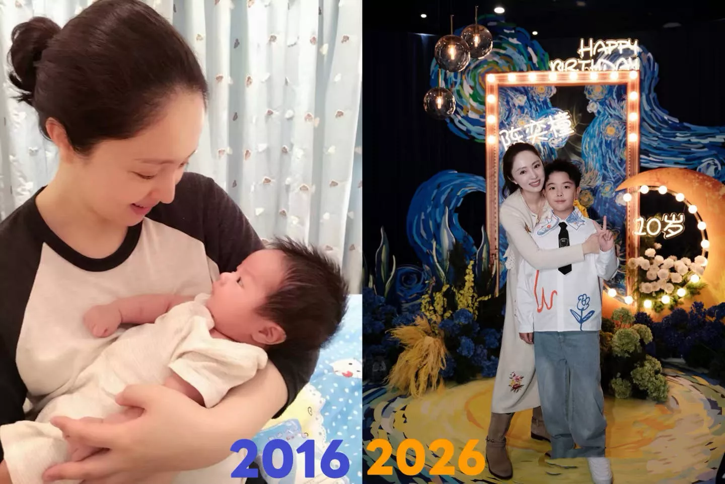 董璇晒出10年前抱着婴儿时期朵朵的照片,那时候小酒窝还在董璇的肚子里,董璇面容慈祥、笑得温柔。