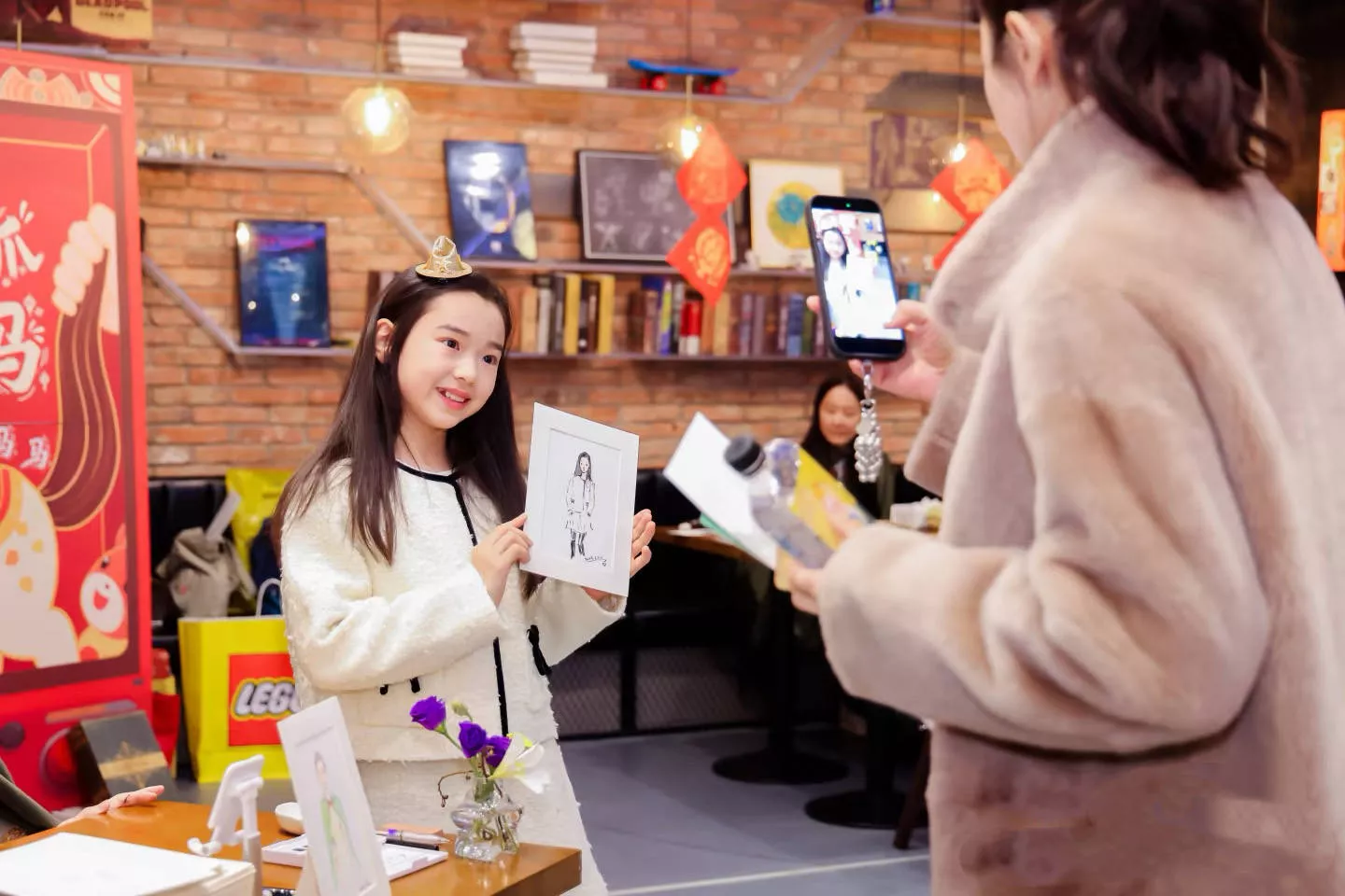 还有小朋友们的自画像,小酒窝拿着自己的画像拍照,她戴上小小的皇冠装饰,整个人更是美得发光。