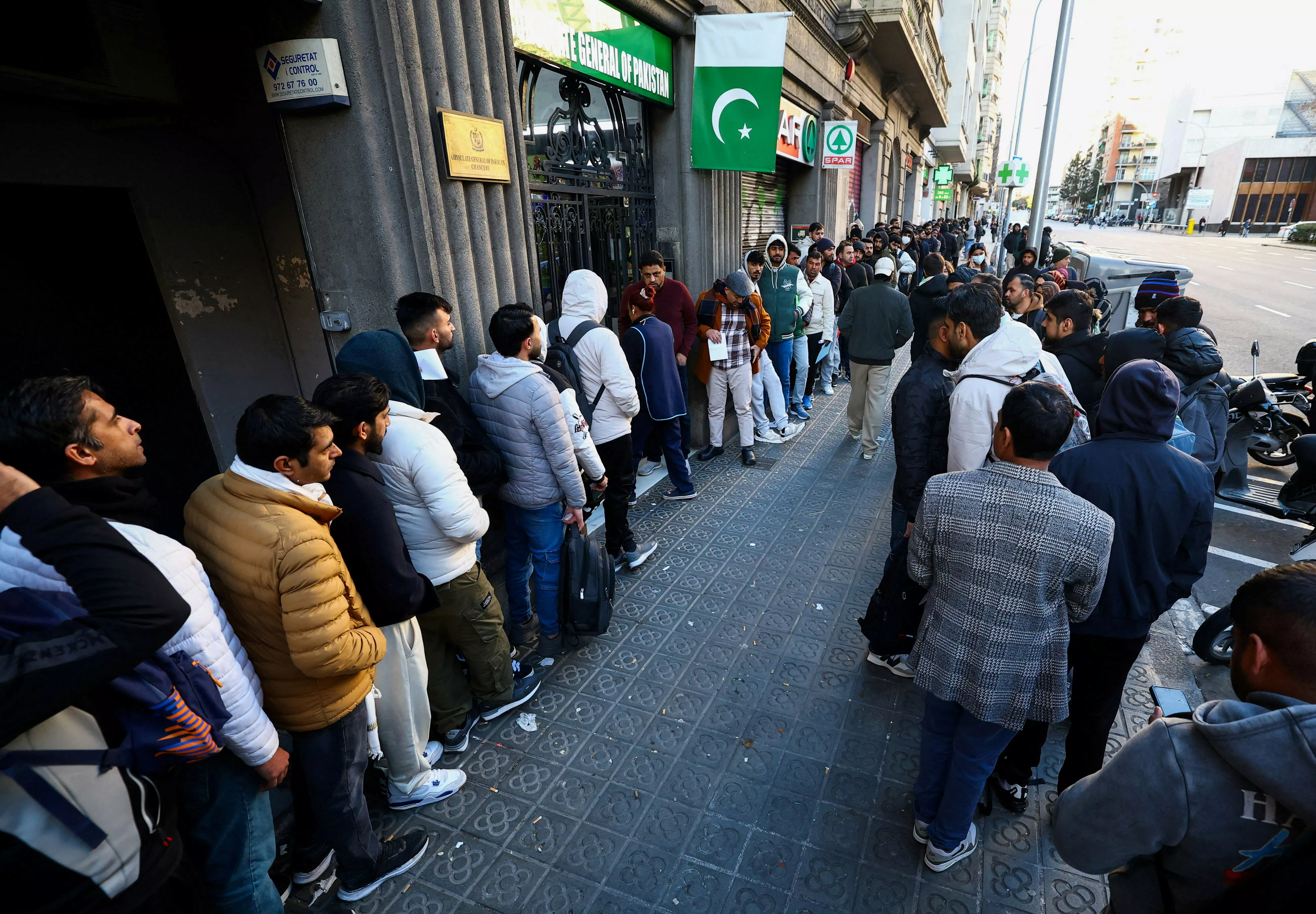 2026年1月30日,大批民众在巴塞隆拿的巴基斯坦领事馆外排队申请刑事纪录证明,这是西班牙政府最近宣布的移民合法化计划所必需的文件。西班牙计划赋予约五十万无证移民合法身份。(Reuters)