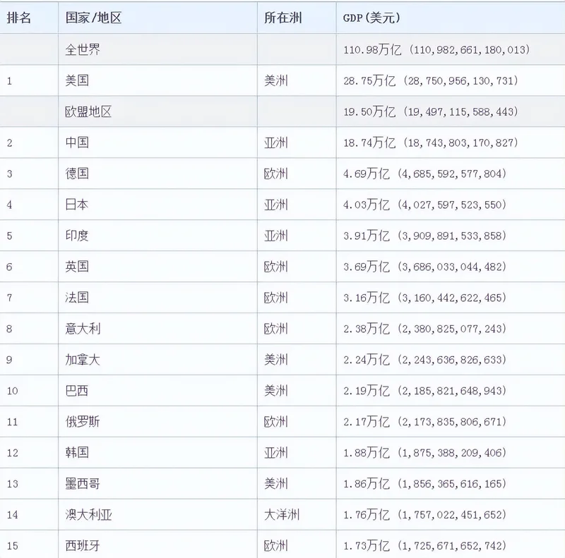 2024年全球GDP前15的国家