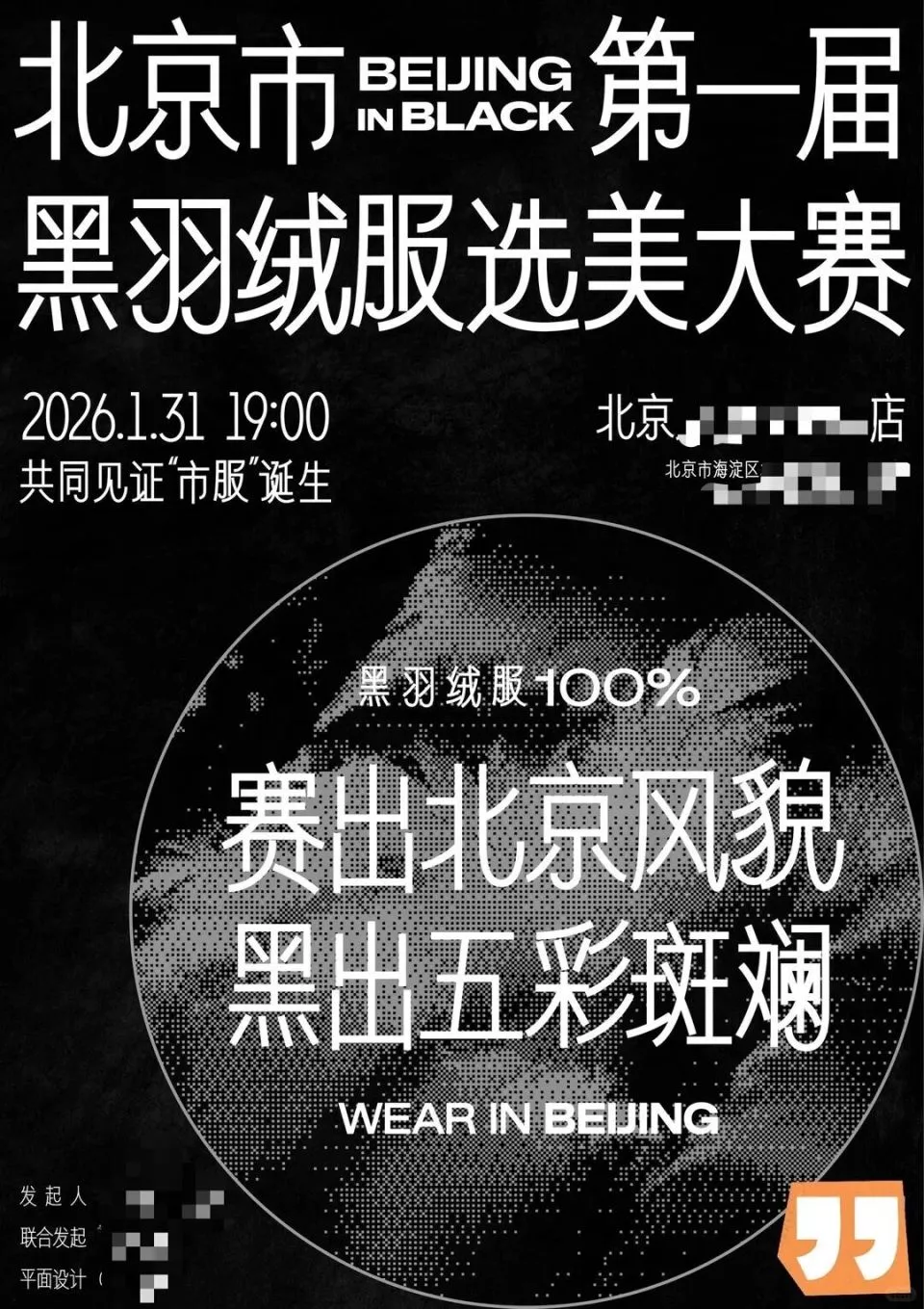 无论造型是高校校服样式,还是面包款、排骨款,在这一刻,都拥有了一个共同的称谓:北京市冬日限定市服。甚至,就在今日,北京市的某商家还举办了北京第一届黑羽绒服选美大赛。
