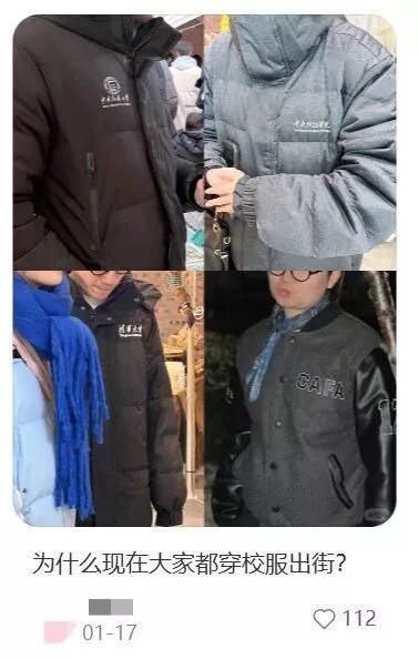 因此,走在北京的街头巷尾,我们不难会看到人们穿着不同学校的纯黑或纯灰款校服,除了校徽以及学校标识略有差异之外,羽绒服的整体设计风格几乎如出一辙,进一步强化了黑羽绒服在日常穿搭中的普遍性。高校校服也在无形之中起到了推波助澜的作用,让黑羽绒服坐稳了“北京市服”的地位。