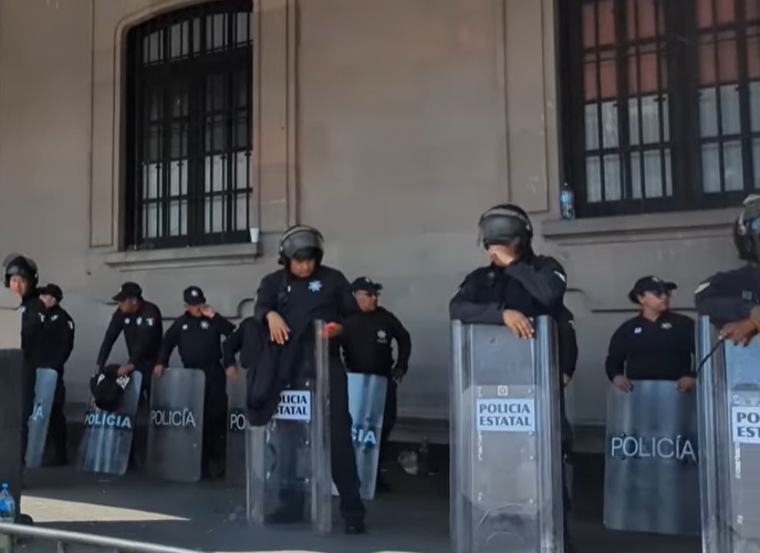 到底是什么事?牌子上写的是为了他们的健康保险健康福利。那么如果观众们记得的话,前一天我们在 Morelia 莫雷利亚也经历了游行,事由和这个是一样的。当时那有位女士说这是一个全国性的运动。这边的男士说他们是为了教师,是教师联合到一起来争取他们的健康保险福利。他说要为很多很多的教师来争取权利。