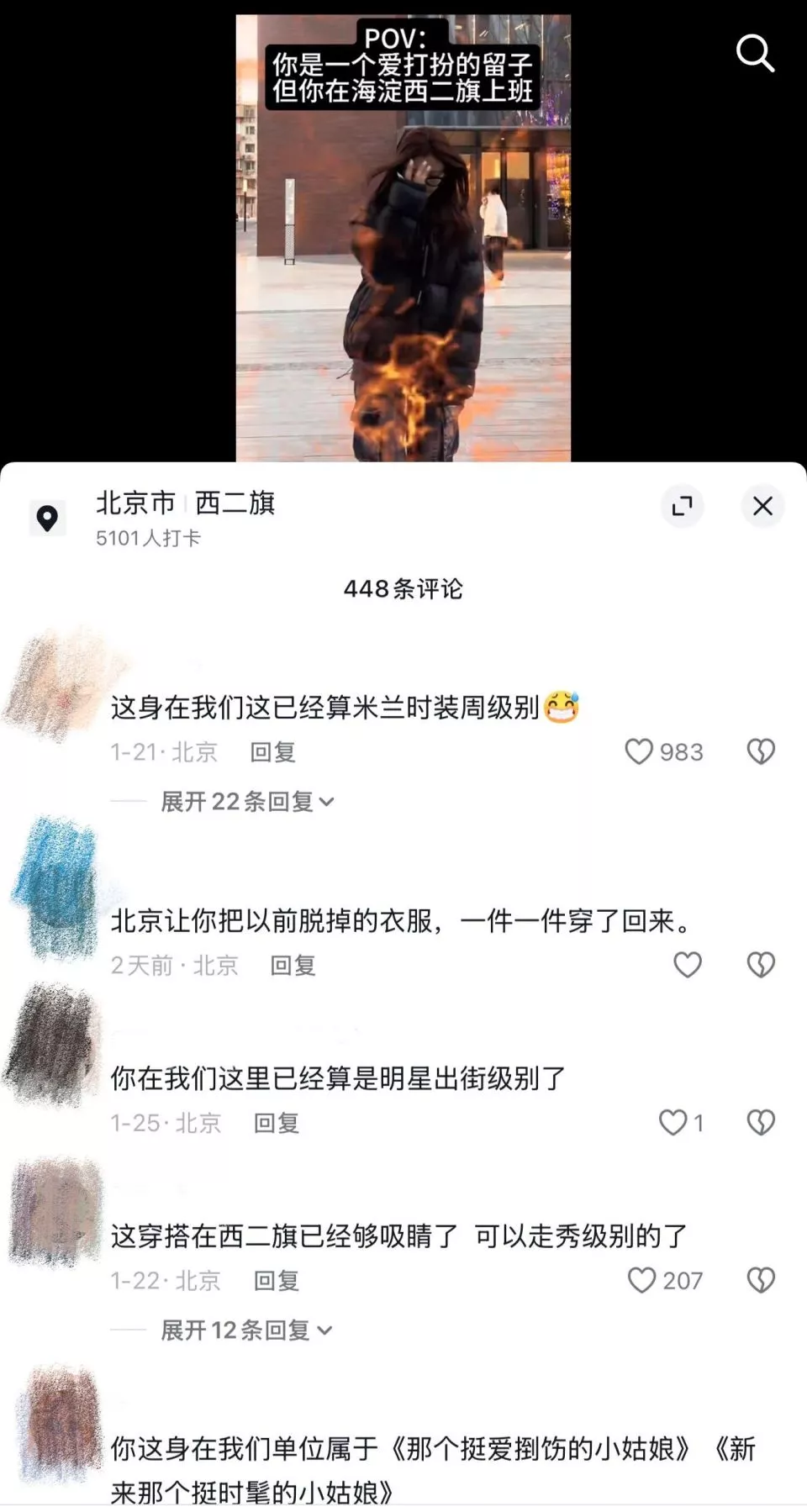 这份心照不宣的生活共鸣,更在互联网上催生出诸多趣味调侃。就像当下大热的网络话题 “POV:你是一个爱打扮的‘留子’,但是你在海淀”,欲抑先扬、充满反差感的一条条趣味短视频,精准戳中了每个在北京生活的人的反审美焦虑。