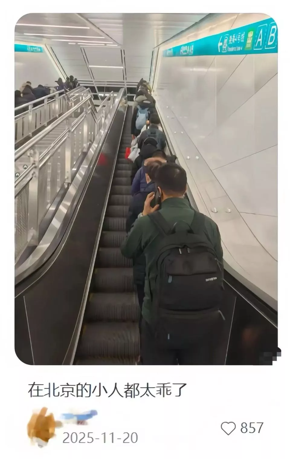 而在北京,也有着这样一条隐性规则——扶梯左行右立。无论是在商场里,还是地铁通勤路上,大家都会统一在扶梯上站在右侧,左侧留给着急的人群赶路。