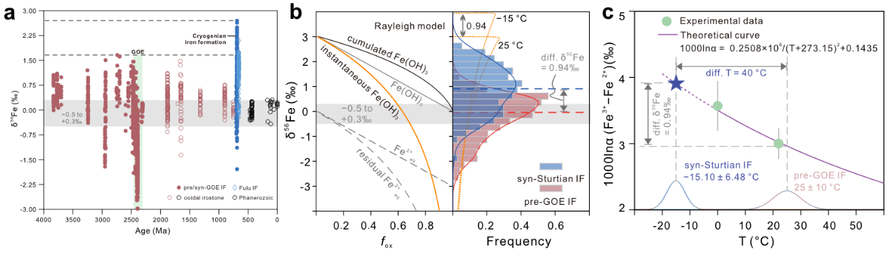 (a)地球历史时期铁建造的铁同位素值分布;(b)铁建造形成过程的铁同位素瑞利分馏模型及其雪球时期铁建造和大氧化事件前铁建造的δ56Fe值的相对频率分布;(c)基于铁同位素分馏的温度依赖效应推算,雪球地球卤水温度可低至 –15 ± 7℃