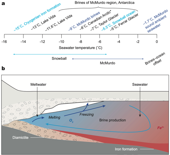 (a)雪球时期与现代南极水域温度对比;(b)成冰纪铁建造沉积与卤水形成模式