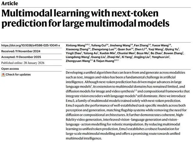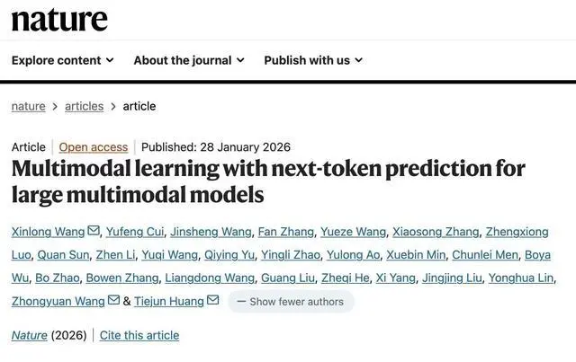 2月1日报道,北京时间1月29日,北京智源人工智能研究院推出的多模态大模型“悟界·Emu”登上Nature正刊,成为继DeepSeek之后第二个达成此成就的中国大模型团队研究成果,也是中国首篇围绕多模态大模型路线的Nature论文。