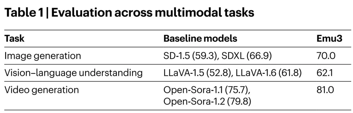 而进入产业应用的前提,是Emu3首先打赢了“性能”这一仗。在多模态生成与感知任务上,Emu3的整体表现可与多种成熟的任务专用模型相媲美。