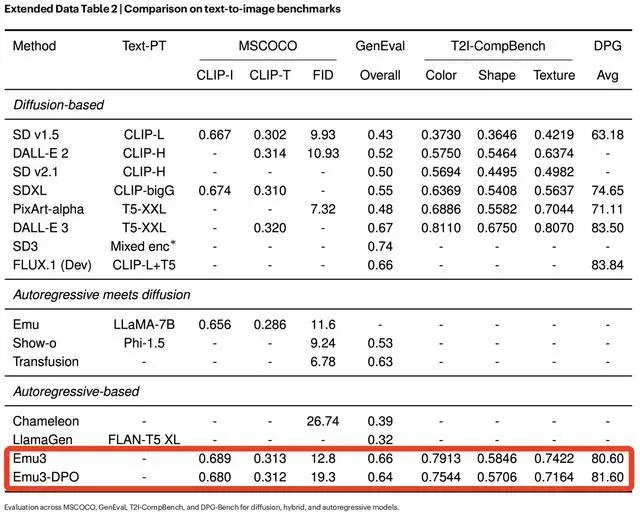 Emu3的性能与最先进的扩散模型相当