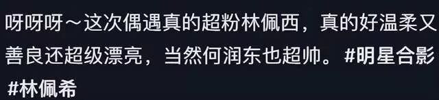 网友就附文夸林姵希温柔善良又超级漂亮,何润东也是超帅。偶遇照中,何润东夫妇将C位让给女粉丝,而在拍照时林姵希主动将身体靠向女粉丝一侧,脸上洋溢着甜美笑容,站在另一侧的何润东嘴角也是微微上扬,夫妻俩亲和力满分。