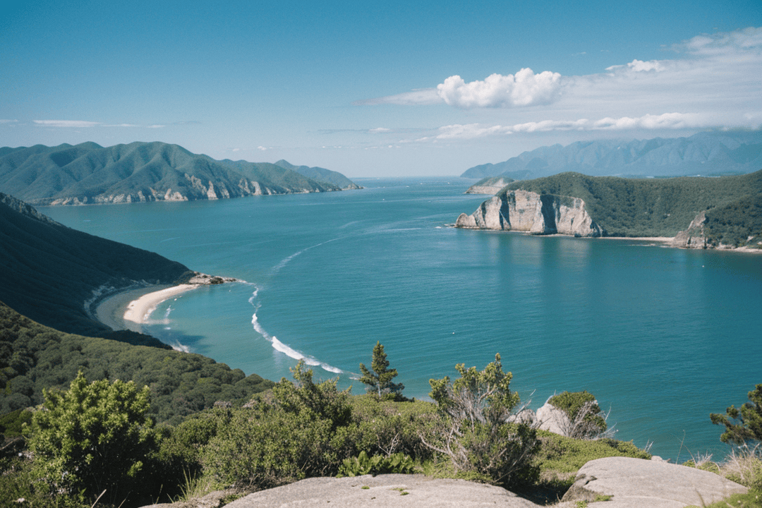 清晨时分,岛屿显得尤为清爽。海面尚未完全被阳光照亮,颜色偏冷,山体轮廓清晰而克制。云雾在山间缓慢流动,使远处景物显得柔和而有层次,整个环境安静而稳定。