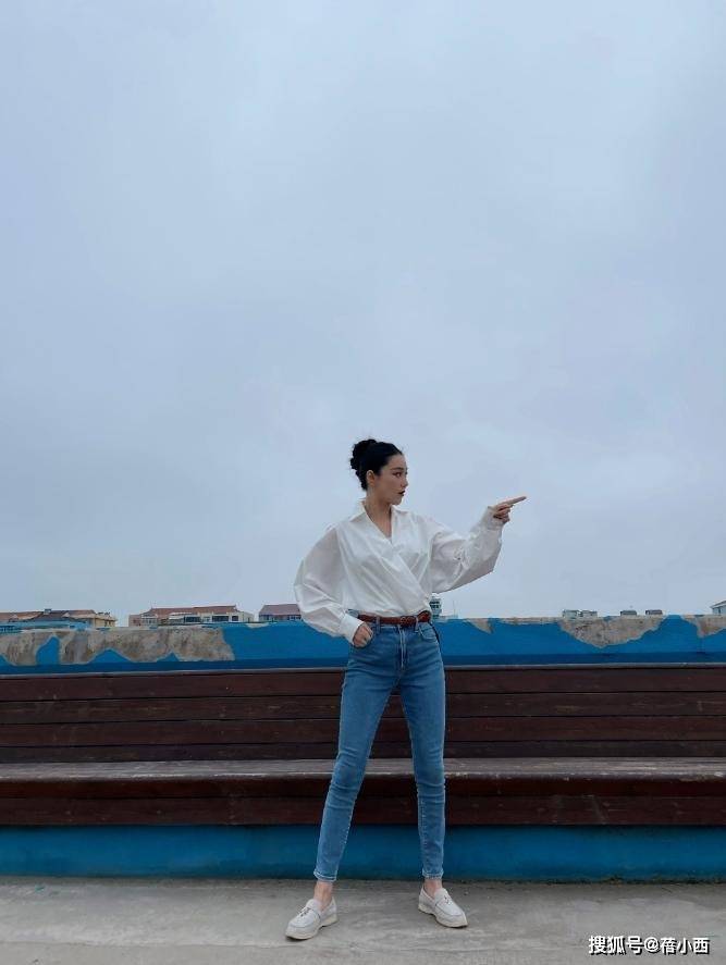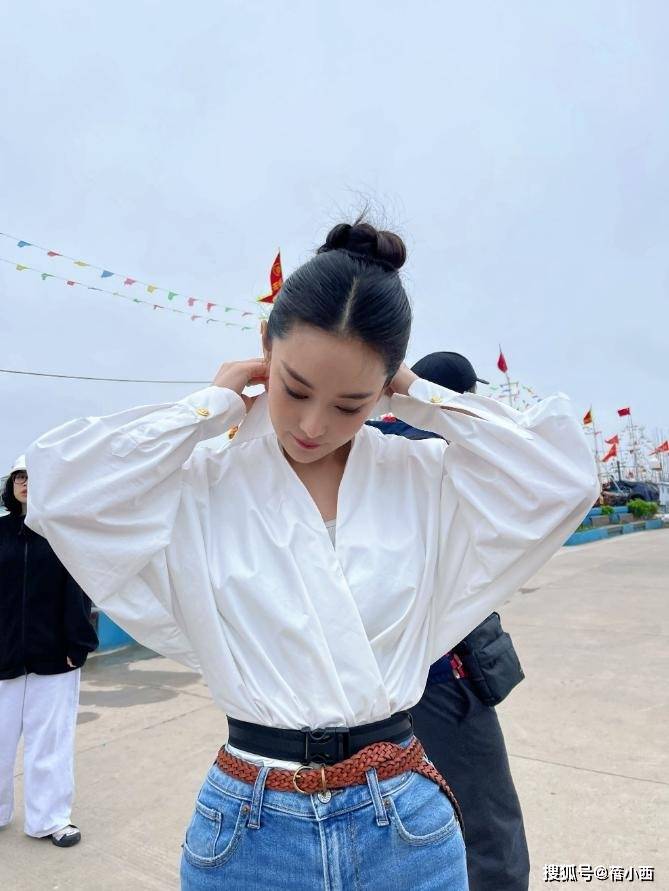 另一组海边天台的造型里,张馨予用一件宽松白衬衫搭配紧身牛仔裤,诠释了“极简即高级” 的穿搭法则,这件白衬衫采用微透面料,灯笼袖设计弱化了肩部线条,加入V 领剪裁露出精致锁骨,她穿的时候还特意系上一条棕色细腰带,目的是打造高腰线,优化身材比例。