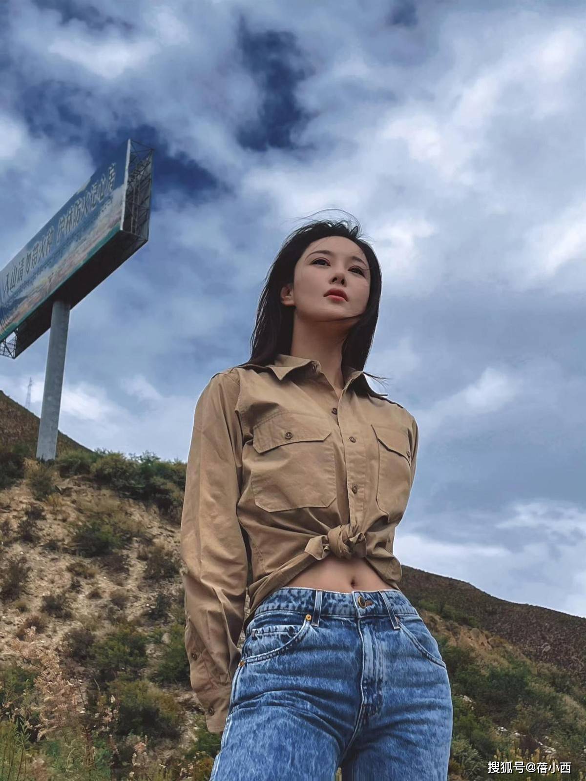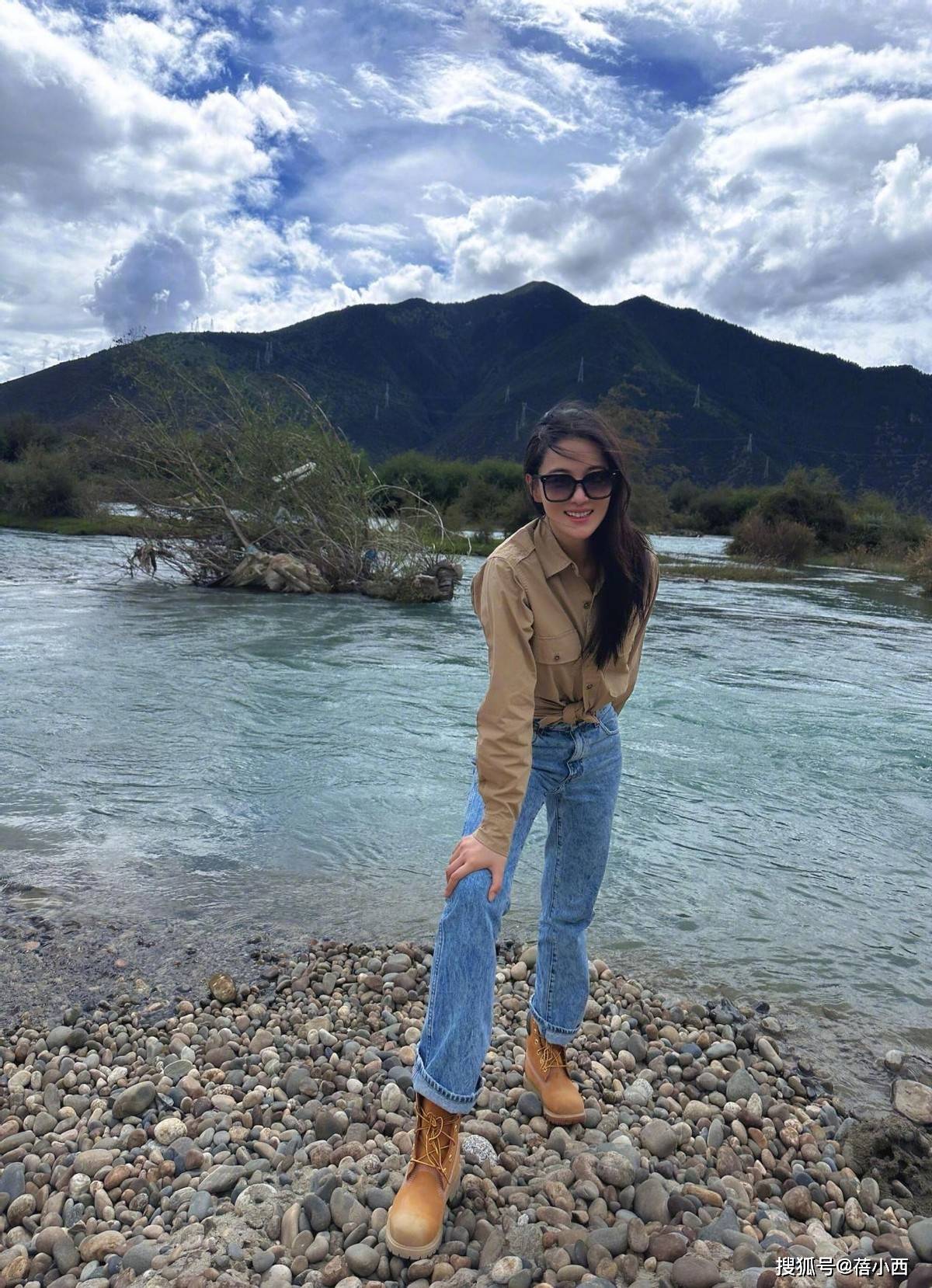 在碧水青山前,张馨予用一件卡其色工装衬衫搭配直筒牛仔裤,更是直接把户外穿搭穿成了时尚大片。卡其色衬衫的硬挺面料自带野性气质,她故意将下摆打结,露出腰线,在宽松版型中勾勒出纤细线条,保留了工装的硬朗,又添了几分柔媚。直筒牛仔裤的微喇裤型恰好遮住小腿线条,配上经典大黄靴,整套穿搭从色彩到版型都透着松弛的户外感。