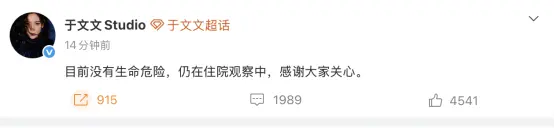随后,于文文工作室通过官方渠道发布情况说明称,于文文已第一时间送医,目前没有生命危险,仍在医院接受观察治疗,并对外界的关心与祝福表示感谢。