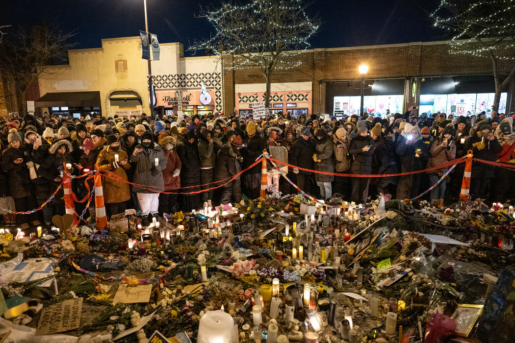 明尼阿波利斯市为蕾妮・古德举行的追悼会。 Jamie Kelter Davis for The New York Times