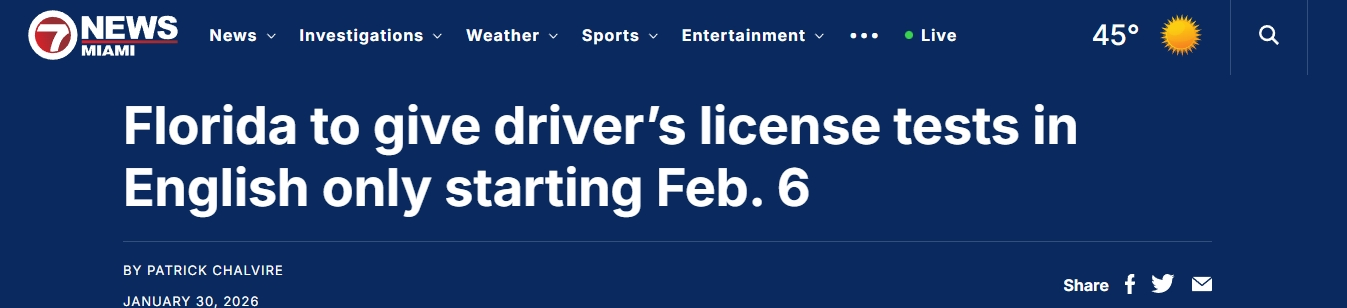 这一调整引发了公众和社会各界的关注。在目前的做法下,佛罗里达的驾照笔试曾提供包括西班牙语和克里奥尔语(海地官方语言之一)等多语种版本,以服务佛州多元文化背景的居民,但新政策将取消此类便利。官方强调,本次变更将于2月6日开始在全州所有考试中心强制执行。
